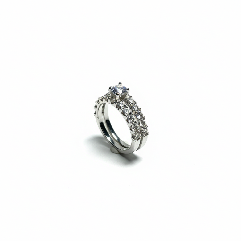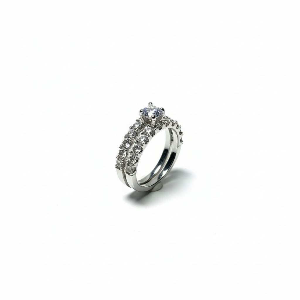 Lleva el concepto de elegancia a otro nivel con el Anillo Dúo Resplandor. Este conjunto consta de dos bandas independientes que encajan a la perfección: un anillo principal con una imponente piedra central de corte brillante y una banda tipo eternity recubierta de cristales. Diseñado para deslumbrar, este set es completamente waterproof.