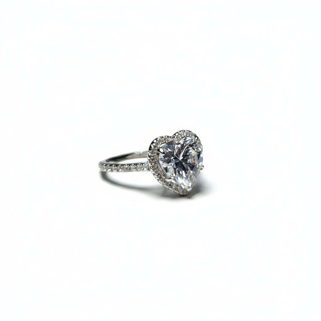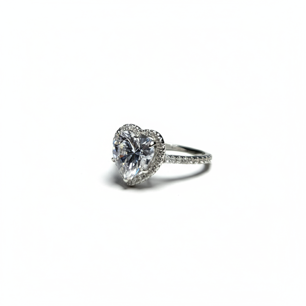 Experimenta el brillo supremo. Este anillo es la definición de elegancia atemporal. Elaborado en Plata de Ley .925 con un acabado de alta resistencia, presenta una espectacular Moisanita central de corte corazón de grado superior.