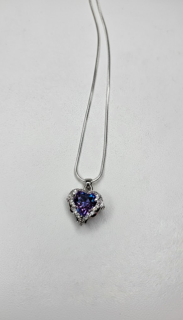 Añade un toque de sofisticación a tu colección con este cautivador collar. Presenta un cristal central en forma de corazón en un delicado tono violeta, enmarcado por un halo de pequeñas circonias transparentes que potencian su brillo natural. Gracias a su acabado en baño de rodio, la pieza luce un color blanco plateado impecable que no solo es elegante, sino también altamente resistente.